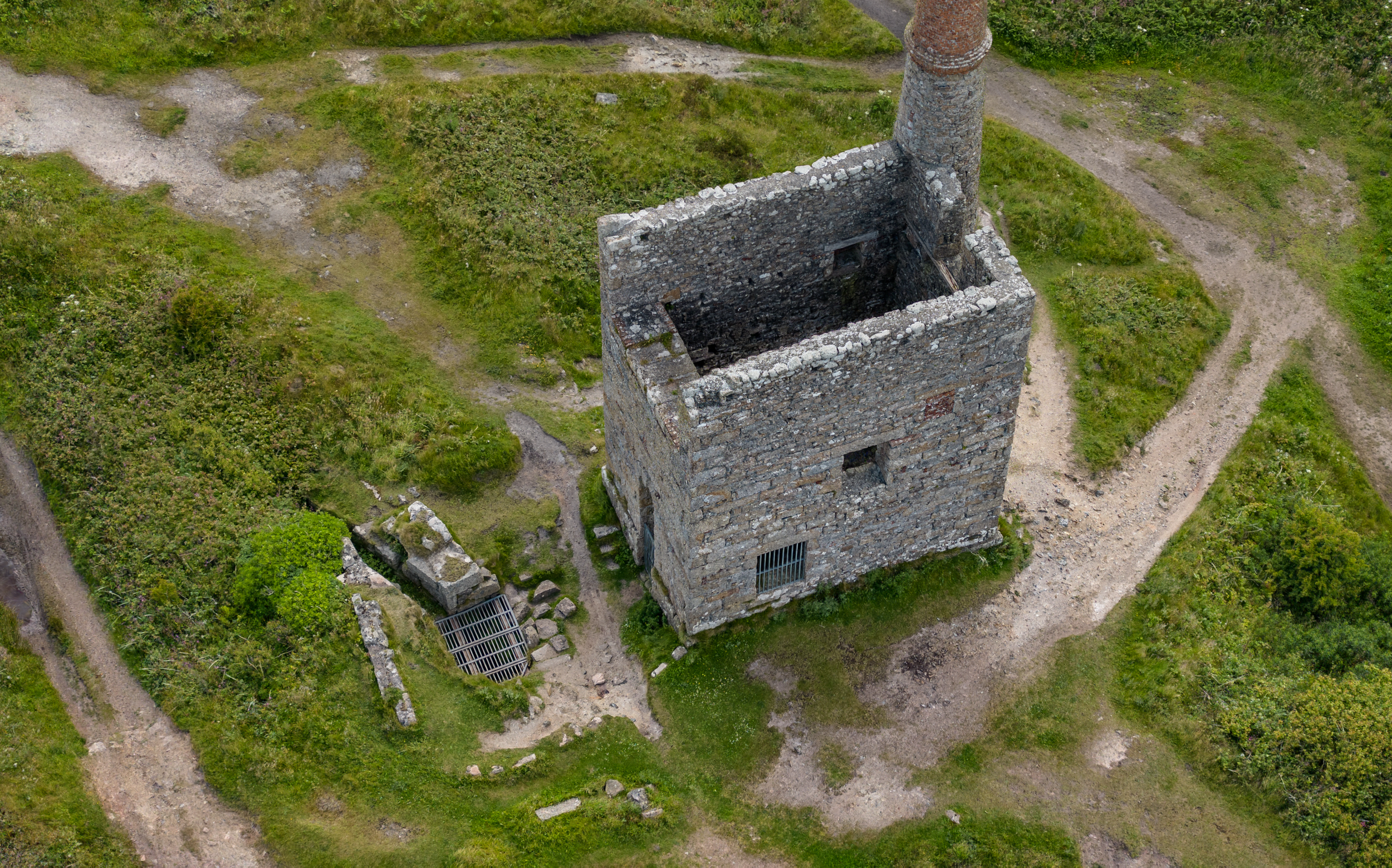 • An aerial view of an old stone tower with a tall chimney, surrounded by grassy paths and shrubbery.